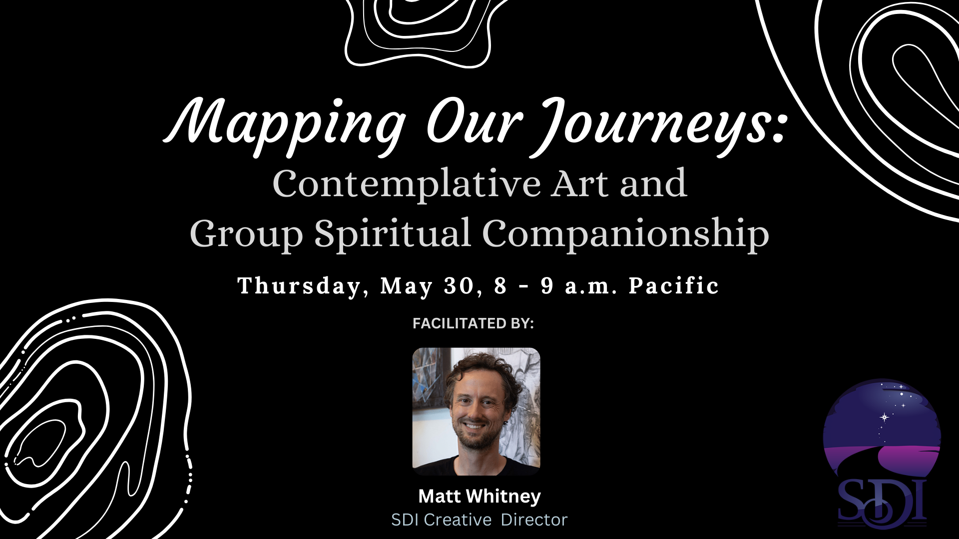 SDI Creative Director Matt Whitney will facilitate this gathering of spiritual companions in which we’ll bring a playful drawing exercise into our time of contemplative sharing. Together and with instruction we will create a very simple drawing of a map, which we can use to discern on aspects of our spiritual journey. No skill or art experience is required for this activity, although doodlers will particularly enjoy it. All that’s needed is a piece of paper, something to draw with, and an open heart. There will be space to share our maps in small groups and in a larger group setting.