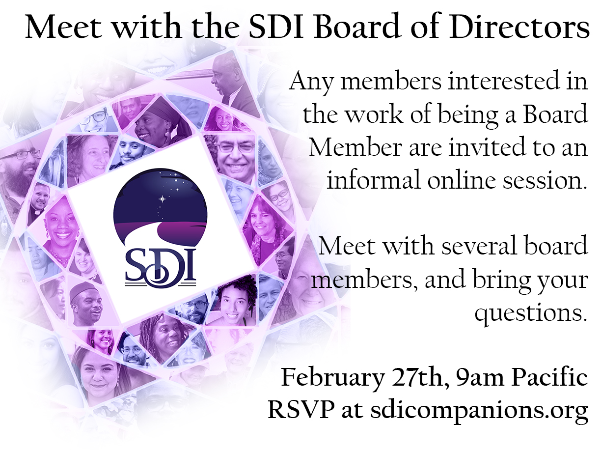 We invite anyone interested or curious about what it means to serve as a Member of the Board of Directors to join several select current Board Members for an informal teatime gathering, Friday, February 27th at from 9-10am PT. Come with your questions, and to discuss any potential interest. No worries if you can’t make it live, as the session will be recorded and made available afterwards to all SDI Members who want to apply.