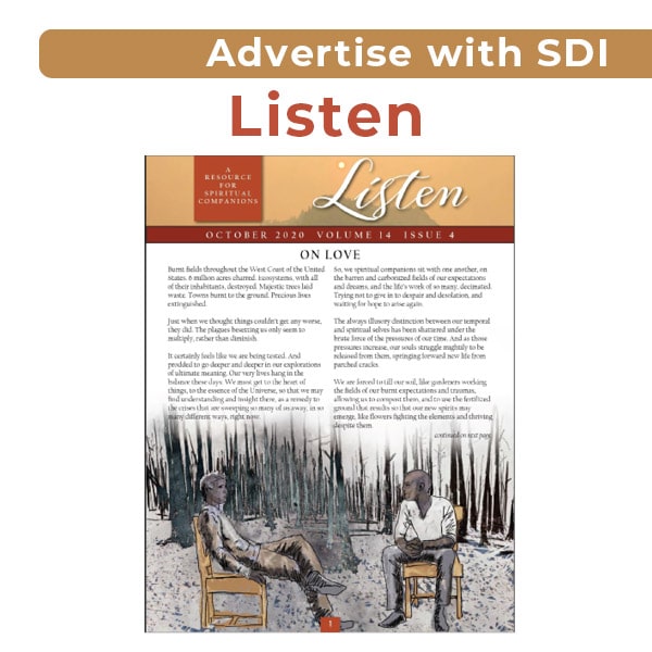 Listen is published four times a year. The names Spiritual Directors International™, SDIWorld™, and SDI™ and its logo are trademarks of Spiritual Directors International, Inc., all rights reserved. Opinions and programs represented in this publication are of the authors and advertisers and may not represent the opinions of Spiritual Directors International, the Coordinating Council, or the editors.