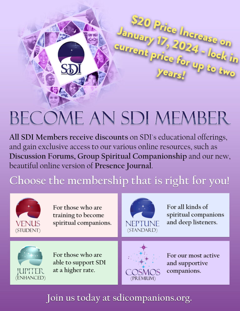 Listen is published four times a year. The names Spiritual Directors International™, SDIWorld™, and SDI™ and its logo are trademarks of Spiritual Directors International, Inc., all rights reserved. Opinions and programs represented in this publication are of the authors and advertisers and may not represent the opinions of Spiritual Directors International, the Board of Directors, or the editors.