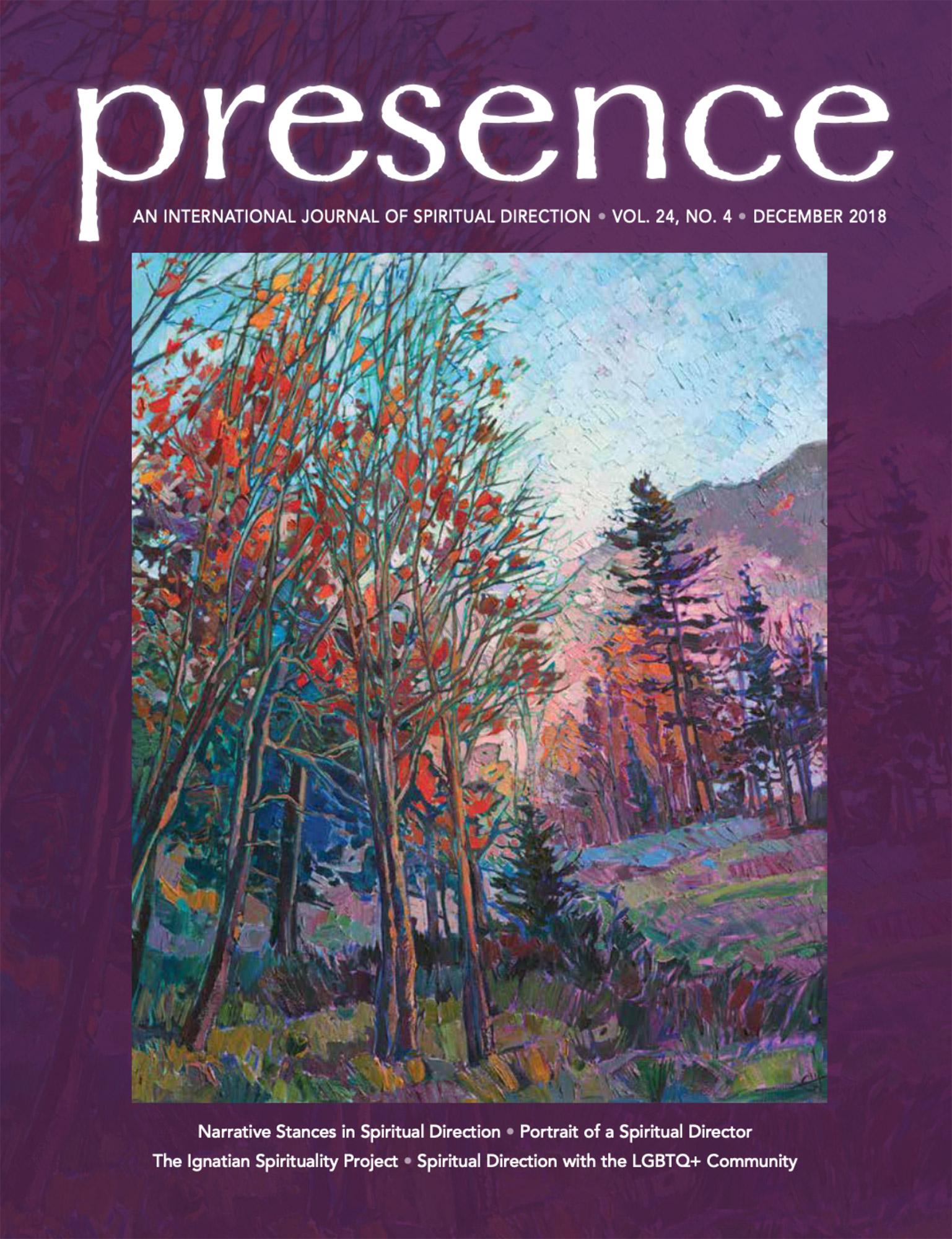 Presence: An International Journal of Spiritual Direction + Companionship is published in March, June, September, and December. Presence offers a forum among diverse people and spiritual traditions for the exploration of present and future trends in the art and practice of spiritual direction. Presence is grounded in the belief that our deepest calling is to be present to one another as we share the gift of ourselves. Presence strives to articulate the essential elements of contemplative practices, formation, and training; to encourage accountability; and to develop clear ethical guidelines. Presence supports a global contemplative dialog of spiritual care and compassion for others, ourselves, and the whole cosmos. ISSN 1081-7662.