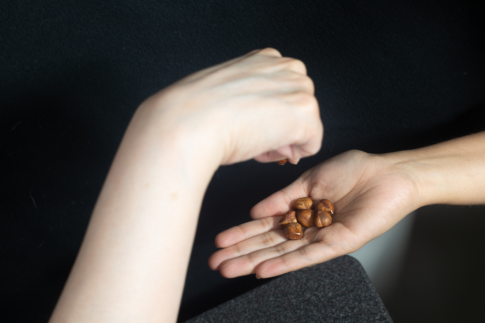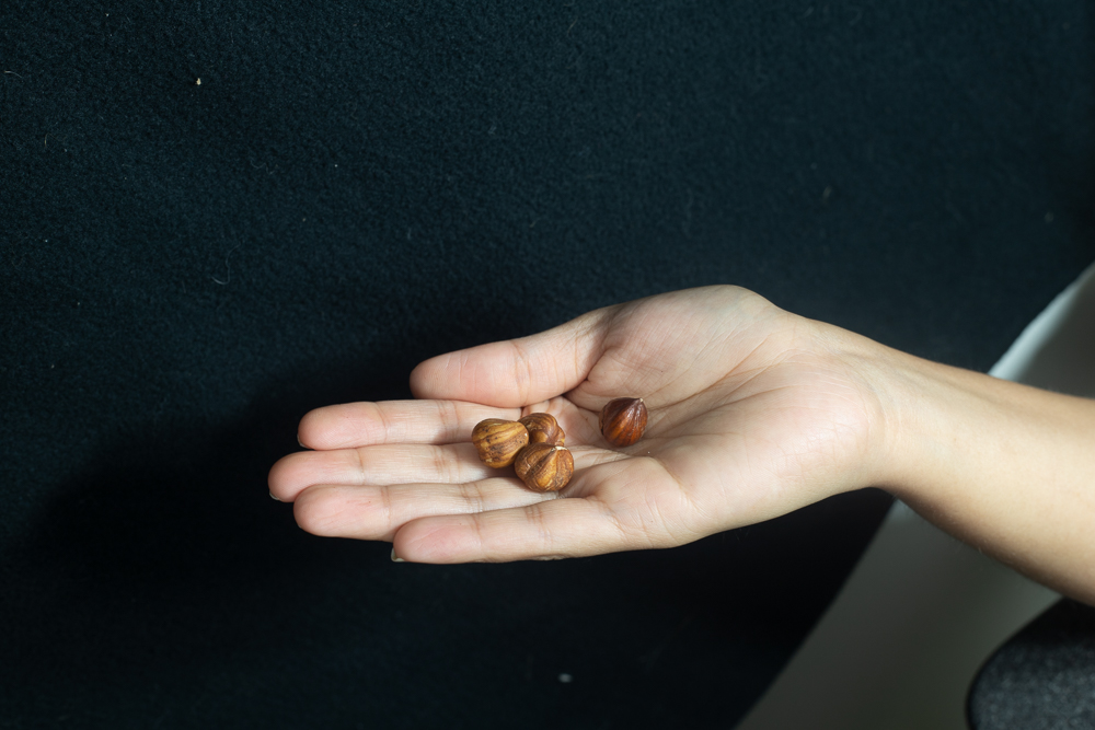 As we experimented, it became apparent to me how to weave in the work of spiritual direction. It could not be “Julian’s” hand alone. Rather, two separate hands—one holding hazelnuts, and another reaching to take one. We started playing with the gesture of one hand giving hazelnuts to an open and empty palm or having two sets of hands holding the same hazelnut, dropping and catching them, which resulted in some interesting action photos that did not for our intentions.