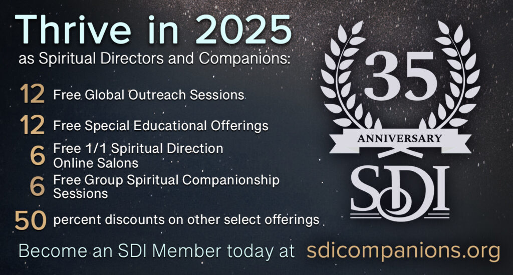 It was at an SDI conference that I heard a call to open my heart more fully to the vastness of the Holy. I was already committed and faithful but this was a clear summons to expand my awareness, let go of building, “religion”, and any preconceived Idea of who God is. I took a sabbatical from church and spent some time with the One who called me by name. I believe I am a better Spiritual Director for having heard and listened to the invitation. I am grateful to SDI for that.
